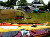 Dat gold ook voor Jan V, die geconfronteerd werd met een opengesprongen reparatie, in de kuip van z’n boot, die daardoor snel vol liep. Na het diner (sommigen bij een cafetaria, anderen kookten liever zelf wat) was er voor de avond een “nachttocht” gepland. Maar ja, twee boten niet-inzetbaar! Doordat Margriet en Bertien weer afgereisd waren naar de Achterhoek (en Huib naar de Veluwe), konden Jan en Stijn beiden (met permissie) een andere boot gebruiken. Jan had weliswaar zijn boot provisorisch gerepareerd (met duct-tape), maar de tochtleiding had daarin geen vertrouwen. Dus ging Jan toch in aan andere boot. Niet iedereen voer mee. Ik was een van de achterblijvers die liever wat bij de tent rommelde en vroeg naar kooi ging. |