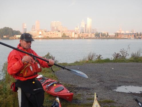 Gezien de soms uiterst verwarrende golfpatronen op de Nieuwe Maas was deze tocht bestempeld als ‘alleen voor ervaren zeevaarders’. Bij het begin van de dag leek dat wat overdreven: Toen we om ca 06.15 uit Zutphen vertrokken, (Wim, Patrick, Joop en ik) was het windstil en erg nevelig. Het was in Rotterdam even zoeken naar het strandje waar we zouden starten (Strand De Esch), maar daar lag de Maas er strak bij, in de nevel en met opkomende zon achter de indrukwekkende skyline van Feijenoord. We konden er ook prima vrij parkeren. Omstreeks 08.15 gingen we te water en voeren mèt stroom westwaarts. Dit deel van de Nieuwe Maas is nadrukkelijk onder invloed van getijbeweging. Maar in tegenstelling tot wat je meestal op getijdenwateren ziet stroomt het water hier niet zes uur westwaarts en vervolgens weer zes uur oostwaarts. Door de voortdurende waterafvoer van de rivier heeft de vloedstroom er moeite mee de overhand te krijgen en zo een oostwaartse stroom te forceren. In de praktijk stroomt het ongeveer 8,5 uren lang uit en daarna weer 3,5 uur lang naar binnen. Wel iets om mee te rekenen.