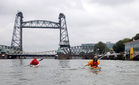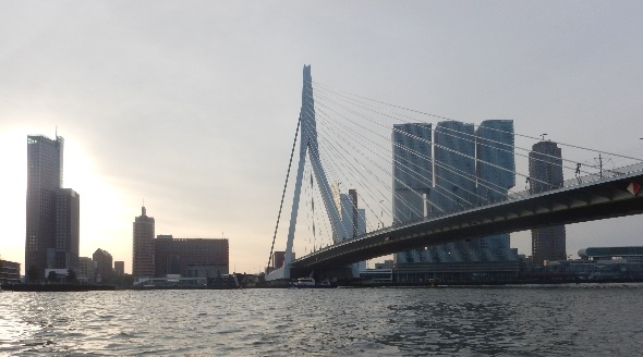 Even verderop staat inmiddels een gebouw van 215m hoog, het bijna voltooide gebouw “Zalmhaven” op de plaats waar zich vroeger daadwerkelijk de Zalmhaven bevond. Het gebouw wordt wel het hoogste van de Benelux genoemd. Vanuit de Leuvehaven kom je vlak voor de Erasmusbrug weer op de Nieuwe Maas, met aan de overkant ook indrukwekkende gebouwen. Het is leuk zo door de stad te varen, de ene na de andere haven passerend. In de Merwehaven, die nog volop in bedrijf is, voeren we een toeristisch rondje langs ladende en lossende schepen.