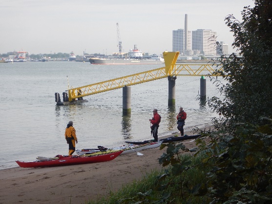 En vervolgens staken we over naar het voormalige quarantaineterrein op de Heyplaat. Daar is een comfortabel strandje, omgeven door groen, (helaas op het noorden !) om een lunchstop te maken. De rivier is hier ca 460 m breed (de IJssel zo’n 90m) Door het matige zicht en de voortdurende scheepvaart is het lastig een goed oversteekmoment te kiezen.