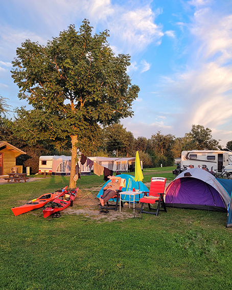 Vorig jaar besloten wij om deze camping als vaste standplaats te gebruiken, en van hieruit diverse tochten te maken. Je kunt veel meer spullen meenemen. Een groter tentje, dikker matras, extra kleding, koelbox en nog veel meer. En.. zeg nu zelf, wat is nu er lekkerder dan na een dag varen neer te ploffen op een fijn setje tuinstoelen met zachte zitting? Precies! Helaas sloeg het weer dat jaar op de tweede dag volledig om en konden wij er geen derde dag aan vast plakken. Wij konden er toen best mee leven nadat wij werkelijk een prachtige dag achter de kiezen hadden, zie het verslag 'Het verdronken dorp'.