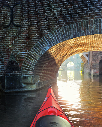 Door de verlichte tunnel onder de Overwelving voeren wij verder onder de Berkelruïne door om even later de Grote gracht op te draaien. Want de grote gracht moet je altijd even meepakken, zelfs daar stikt het al van de watervogels. Wanneer het een doordeweekse dag is voelt zo'n vaardagje stiekum nog fijner. Je ziet de mensen op de fiets, met de auto of lopend naar hun werk of school gaan. En wanneer je heel goed oplet zie je ze zelfs een beetje jaloers kijken. Zelf wisten wij al dat het een zonnige dag zou gaan worden en dat we 100% zouden gaan genieten.